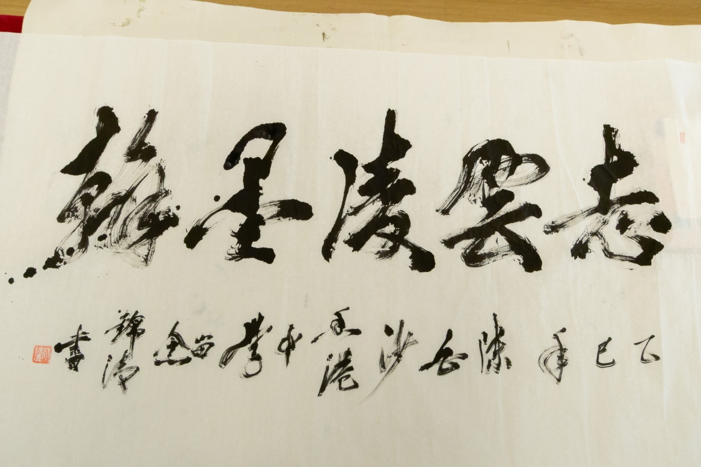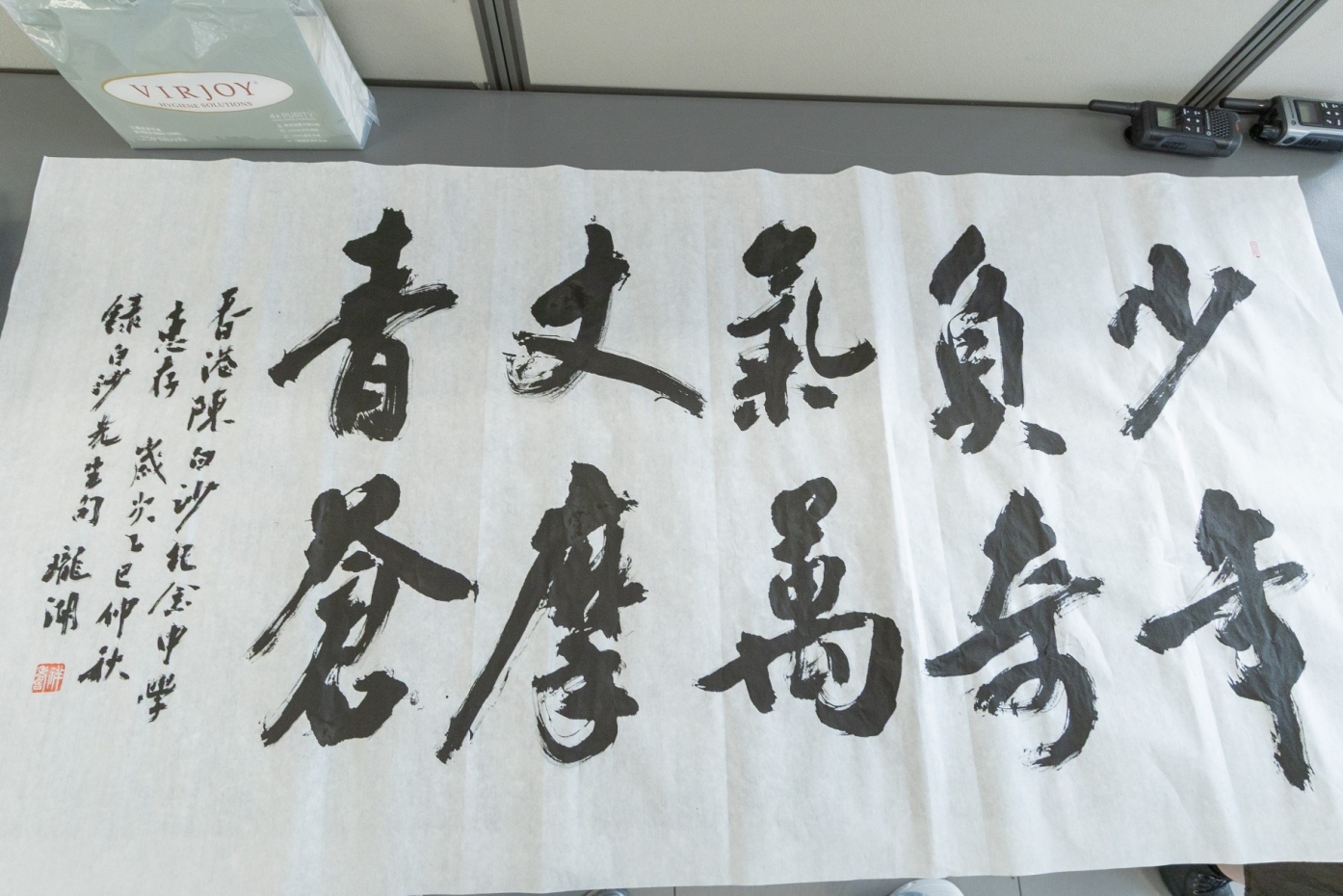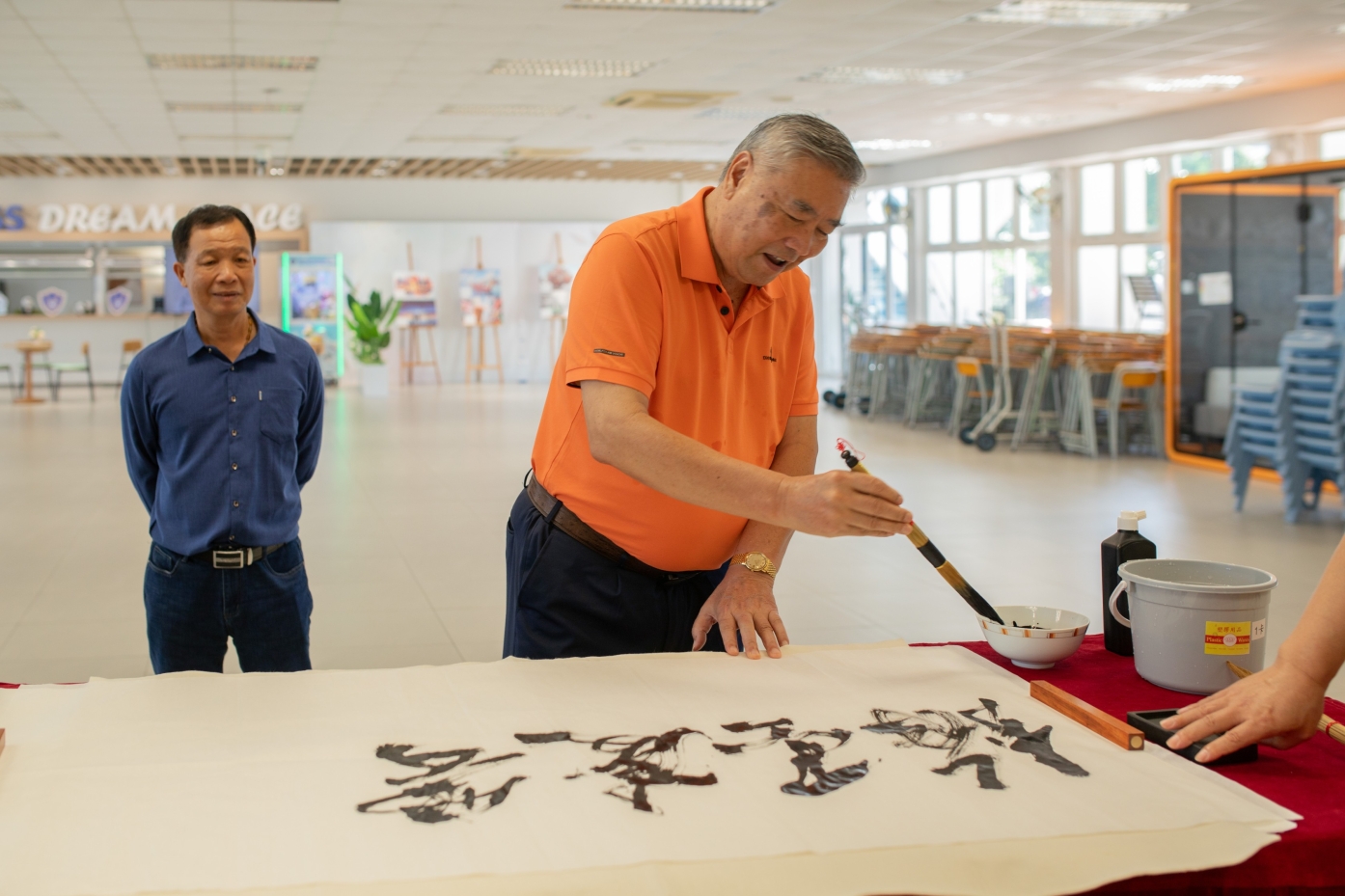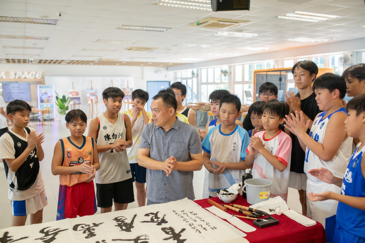 三位學者不僅與學子深度對話,更見證了一場文化傳承的即興展演——林、黃兩位會長當眾揮毫,以筆鋒寄寓期許,留下「翰墨凌雲志」的壯懷墨寶,更提錄陳白沙先生名句「少年負奇氣,萬丈磨青蒼」。