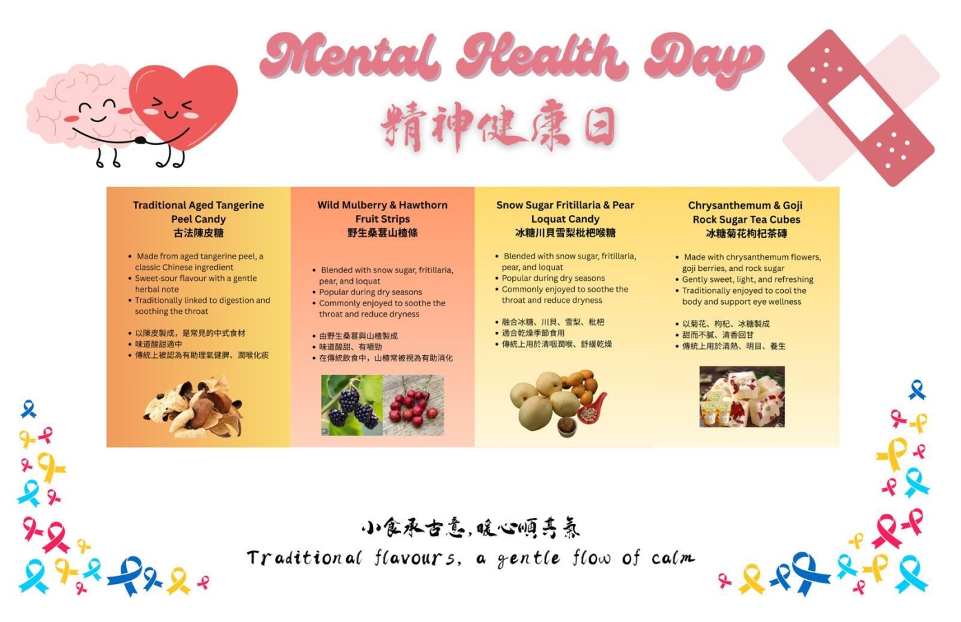 本校十分重視學生的精神健康發展。配合【中醫藥文化主題】,我們透過分享以中式傳統食材製成的健康小食,讓同學在日常校園生活中認識中醫智慧,學習如何從飲食中滋養身心 。