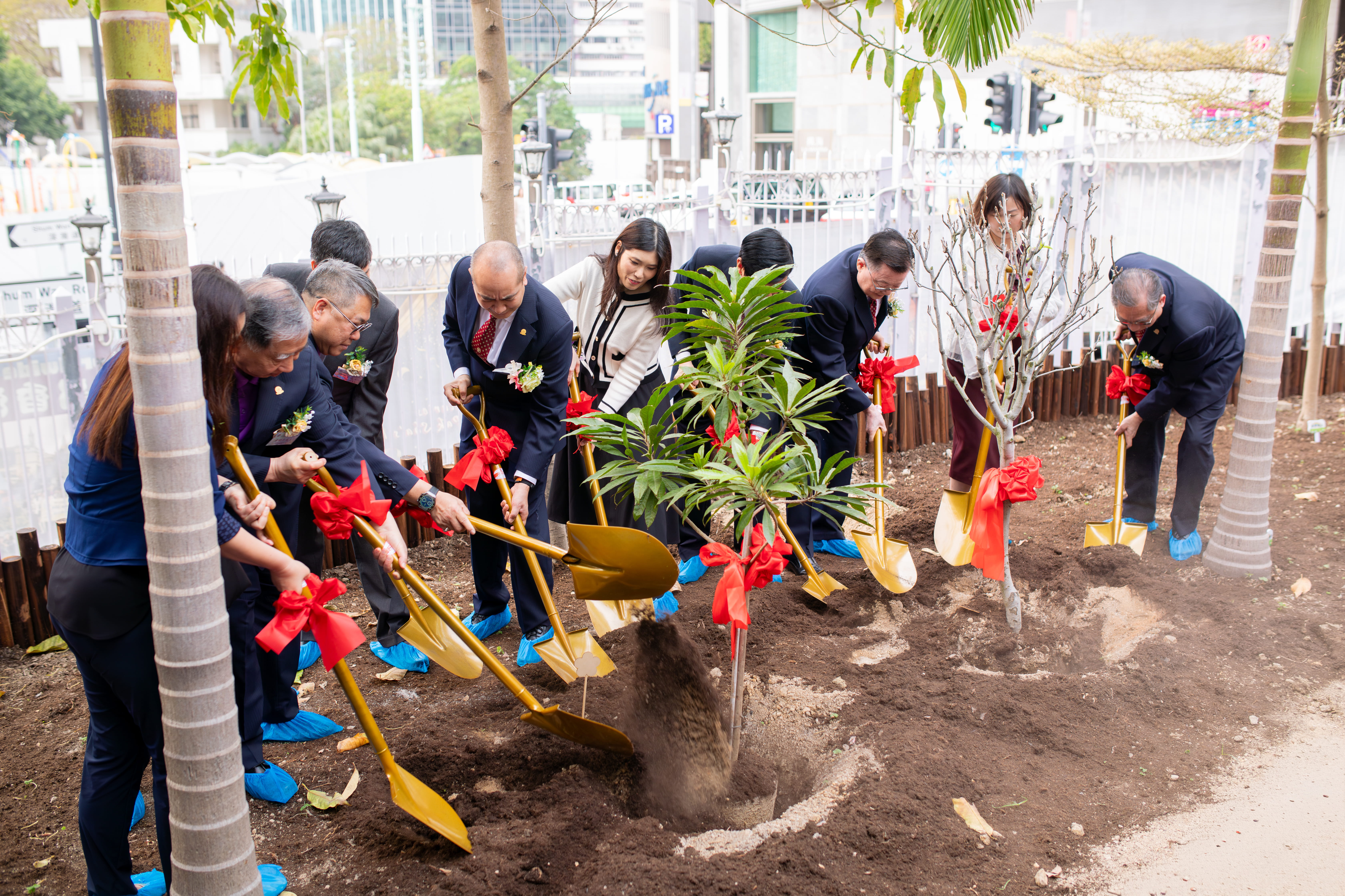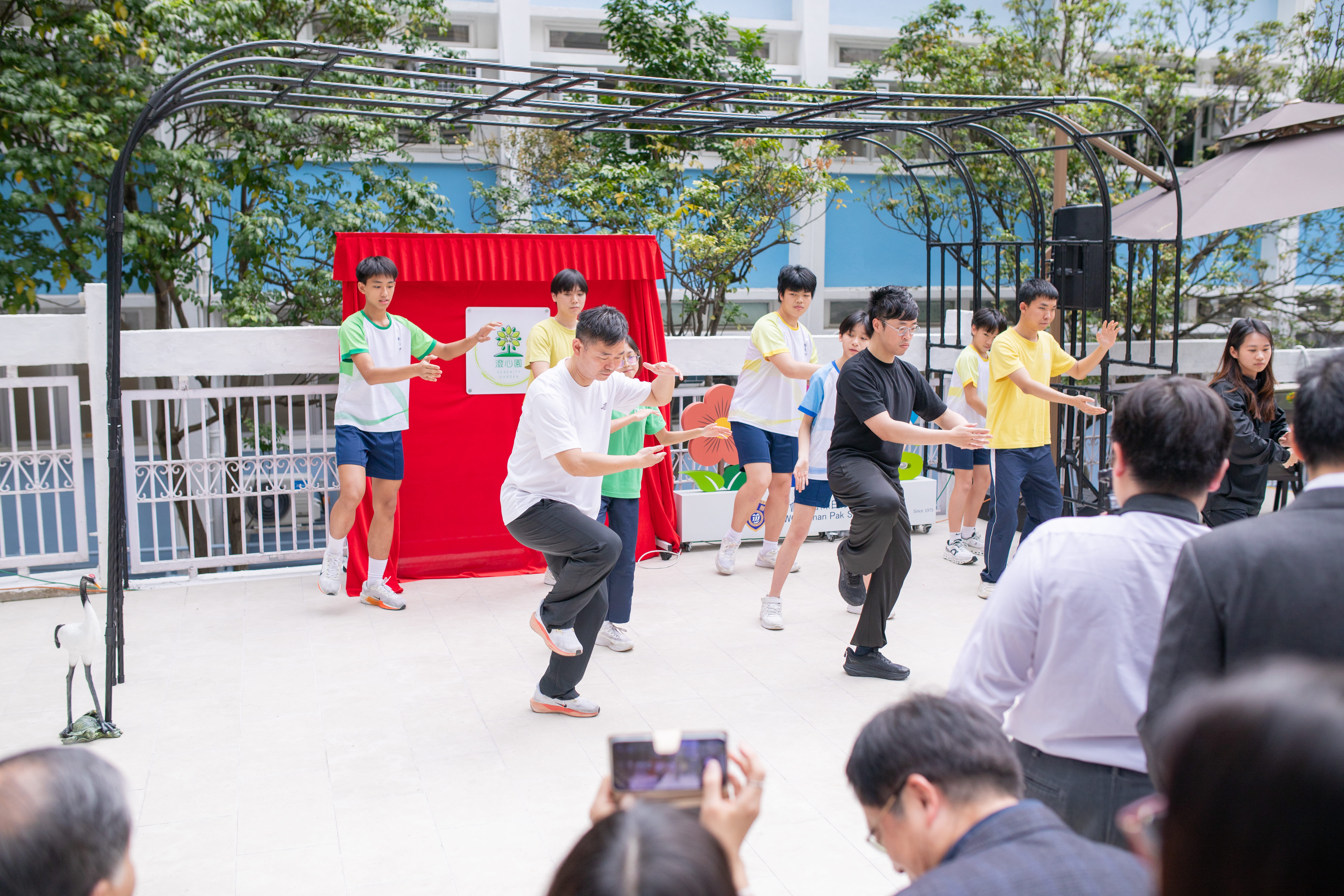 隨後,嘉賓移步至園區進行植樹儀式,栽種香桃與李樹,並放置裝載祝願的「時間囊」。活動現場安排了中醫藥種植環節 ,由新會商會學校與本校學生共同在藥圃栽種中藥草。此外,王詩駿老師同梁啟賢老師、彭金珍老師及本校醒獅隊帶領嘉賓示範養生操。