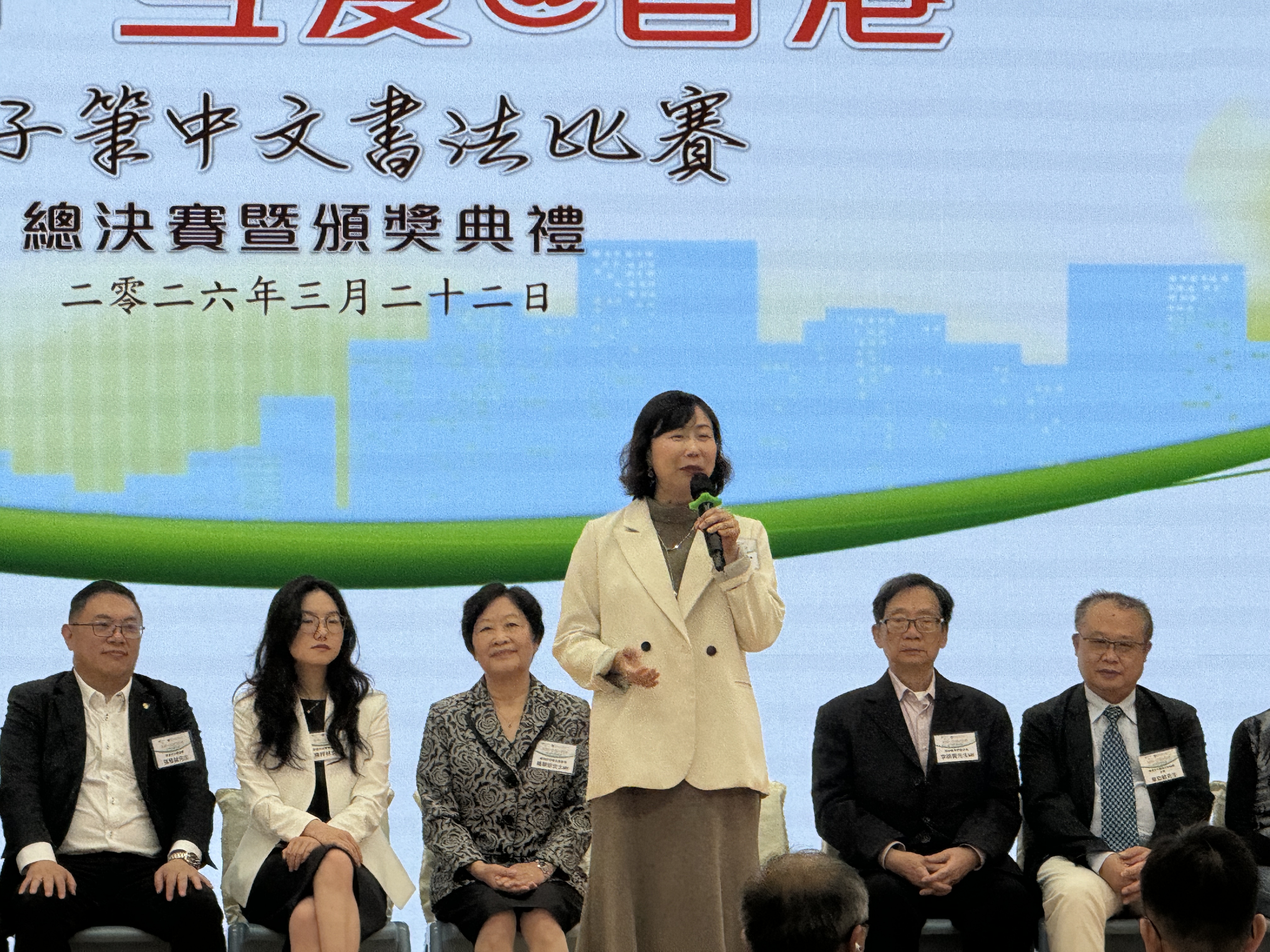 比賽之後緊接舉行頒獎典禮,頒發各奬項前,首先由香港仔坊會永遠會長楊翠珍女士 MH致歡迎詞,然後由協辦單位本校校長陳瑩瑩女士致詞。當日主禮嘉賓還包括南區民政事務助理專員陳梓林女士、香港蘭亭學會主席李錦賢先生 MH、甲子書學會副會長馬潤憲先生、香港文化藝術交流協會主席韋勁敏先生、香港文化藝術推廣協會美術總監謝國燊先生、資深書法家鄭秀霞女士及香港仔坊會理事張惟誠先生。