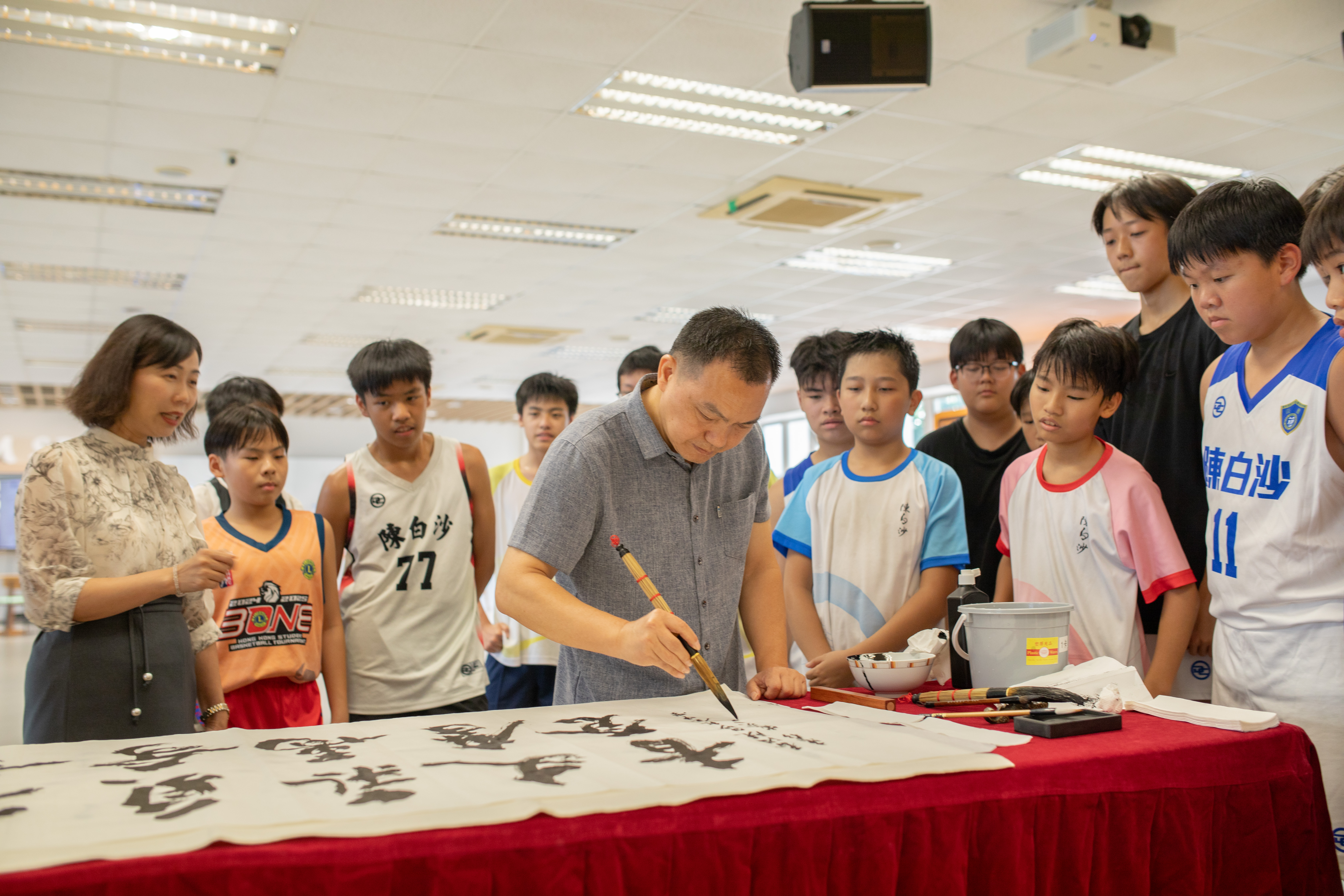 三位學者不僅與學子深度對話,更見證了一場文化傳承的即興展演——林、黃兩位會長當眾揮毫,以筆鋒寄寓期許,留下「翰墨凌雲志」的壯懷墨寶,更提錄陳白沙先生名句「少年負奇氣,萬丈磨青蒼」。