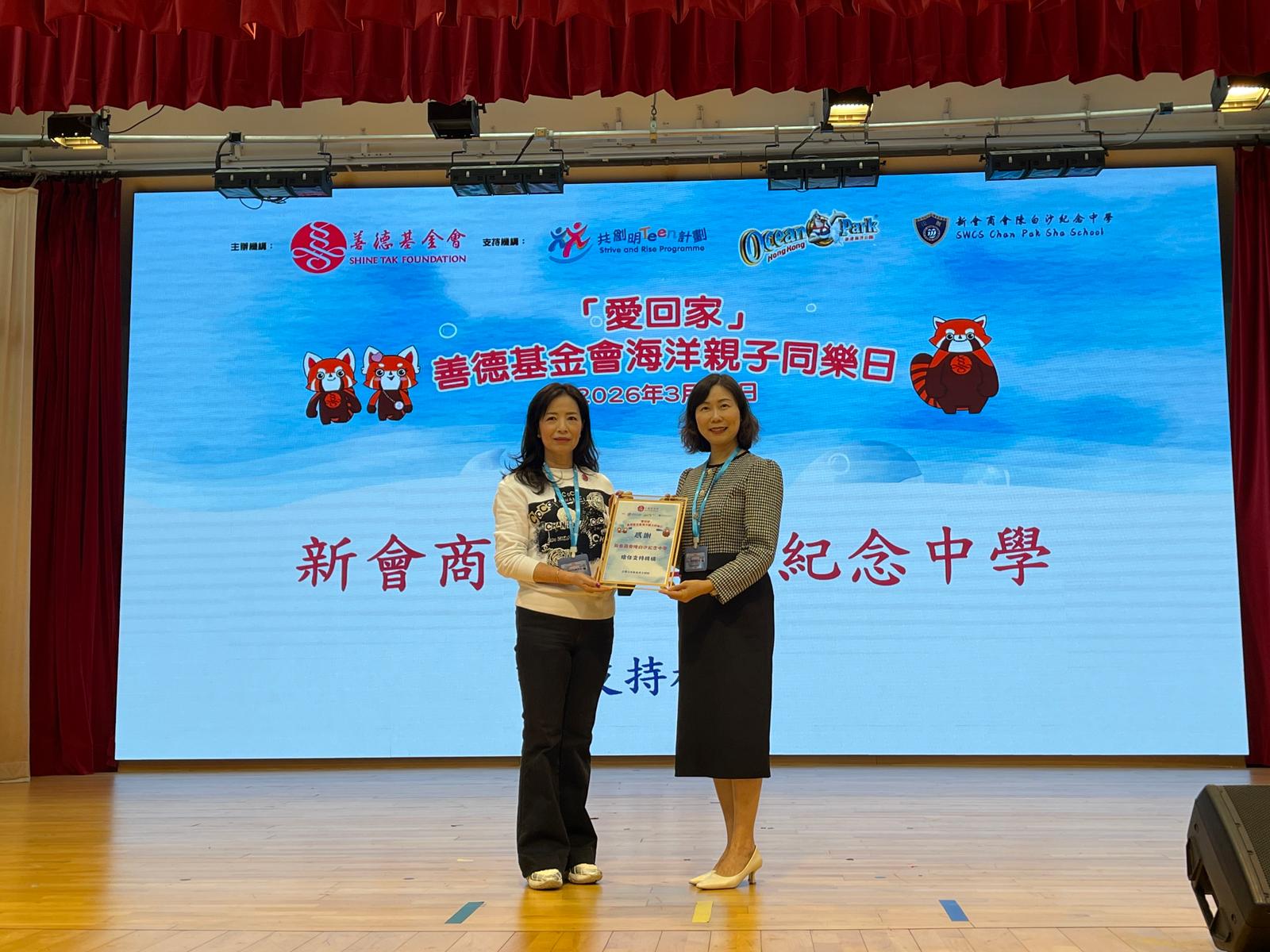 本校於3月14日舉行「愛回家  善德基金會海洋親子同樂日」啟動禮及海洋保育專題講座,活動由善德基金會主辦,共創明「Teen」計劃、海洋公園及本校全力支持。